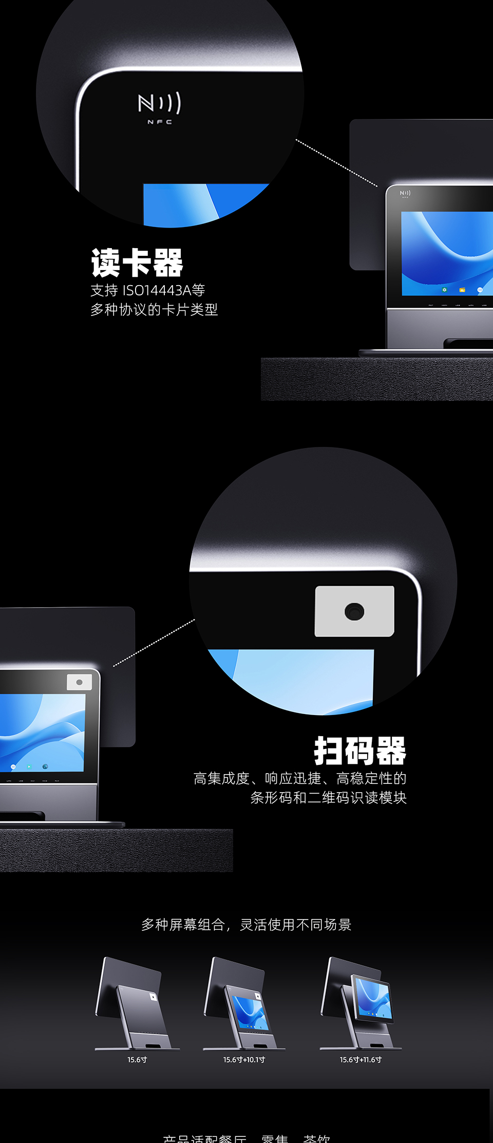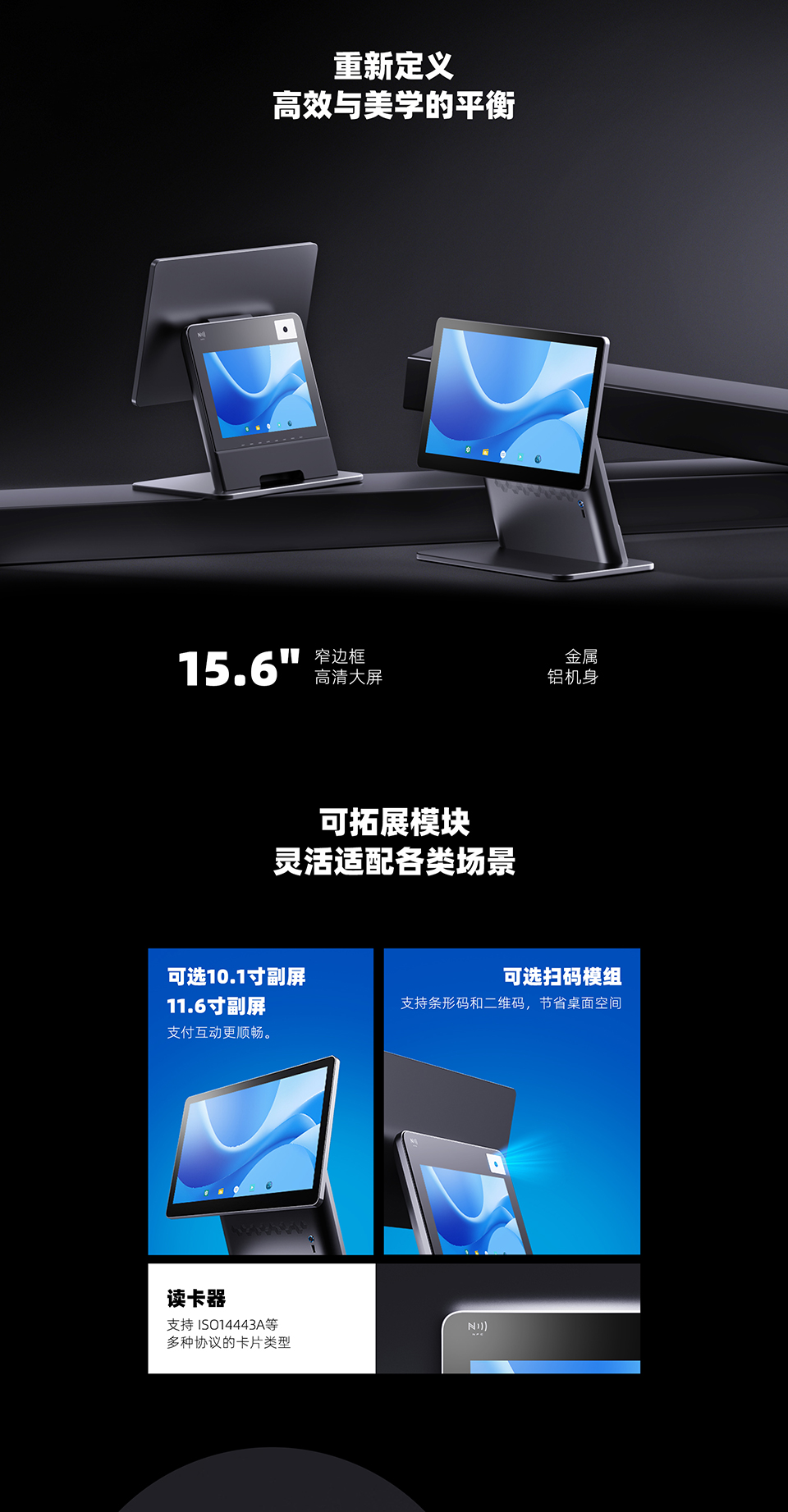 15.6寸单屏1920*1080 RK3568:4核64位Cortex-A55主频最高2.0GHz 2G内存+16G储存 内置二维扫码盒子&NFC 十点电容触摸屏 安卓智能触摸收银机