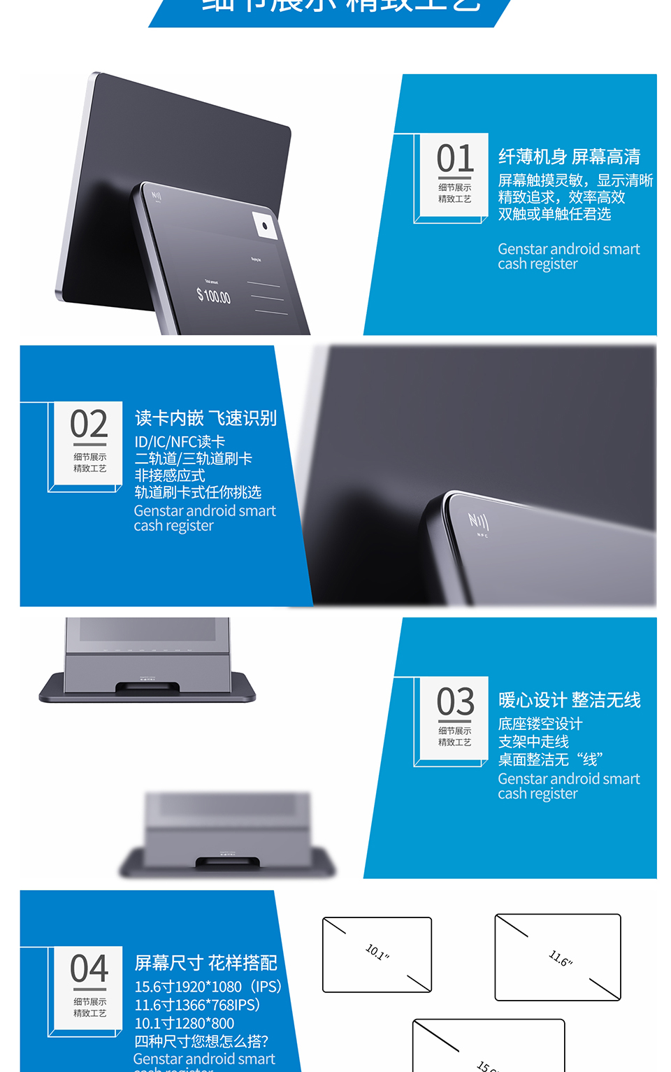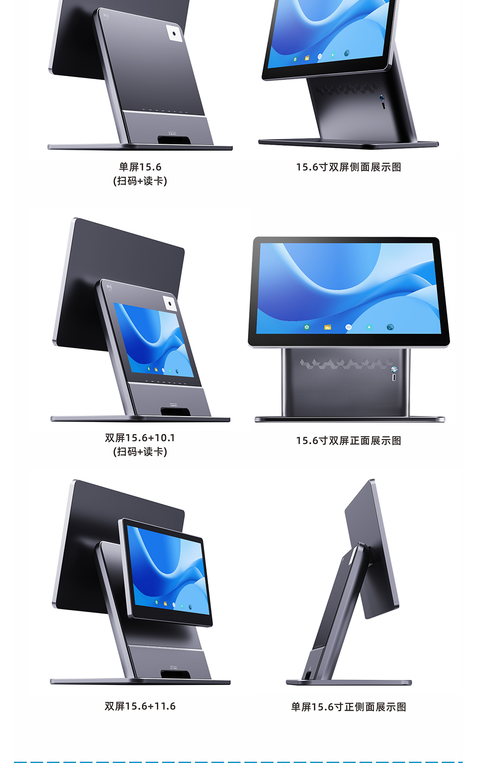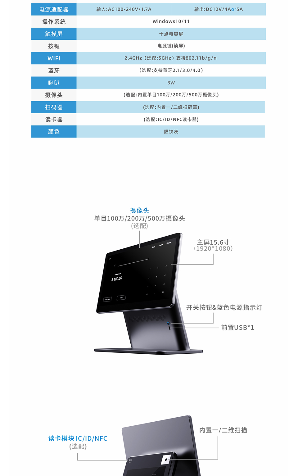 主屏15.6寸分辨率1920*1080 N97处理器 四核四线程 睿频3.6GHz 4G内存+64G储存 内置二维扫码盒子&NFC 十点电容触摸屏